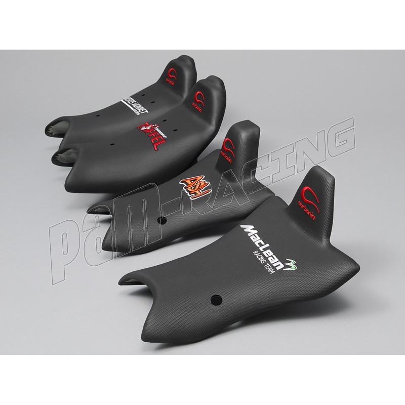 Modèle pro : Selle néoprène Carbonin de type 'pro' sur socle détachable avio fibre.Selle recouverte d'un matérau offrant un grip important primordial dans les courbes.Les épaisseurs du socle, du tampon arrière ou toute autre dimension peuvent être choisies lors de la commande. Ce sont les selles utilisées par les teams officiels en WSBK ou en WSS. Ces selles reçoivent un brodage Carbonin sur le haut de la selle et un brodage à la demande sur la selle.
