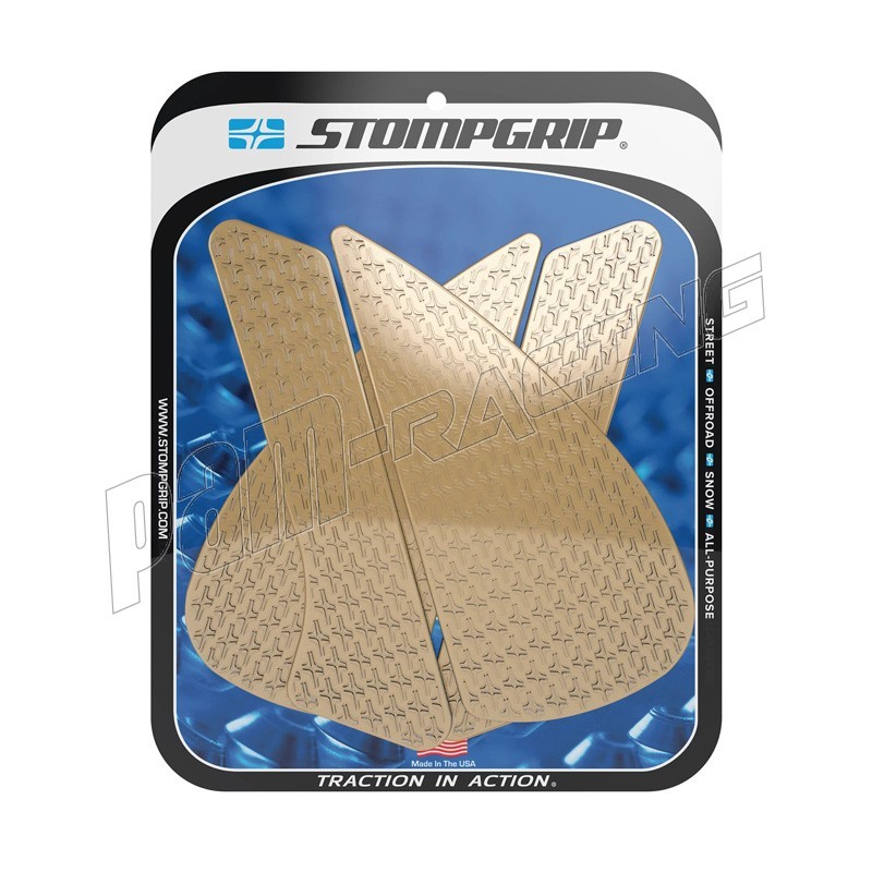 En 2002, STOMP Design élargit sa gamme jusqu'aux sports mécaniques, en lançant les grips de réservoir STOMPGRIP, spécialement conçus pour les moto-cross. Ces grips abrasifs ont pour vocation de garder le pilote en selle, en collant à son pantalon ou à ses bottes. Ils sont depuis lors applicables aux machines de route, de cross ou de quad. Ce sont finalement des accessoires indispensable, et des alliés contre la fatigue et le ballotage, quelle que soit votre machine de prédilection. Les grips sont spécialement conçus en fonction de la physionomie de chaque machine, ils sont également coupés à l'arrondis, afin d'éviter les décollements précoces. La surface en caoutchouc est soit transparente, soit noire, pour respecter l'esthétique de votre machine. Ces produits sont conçus pour s'user à la manière des pneus, et sont à remplacer périodiquement.