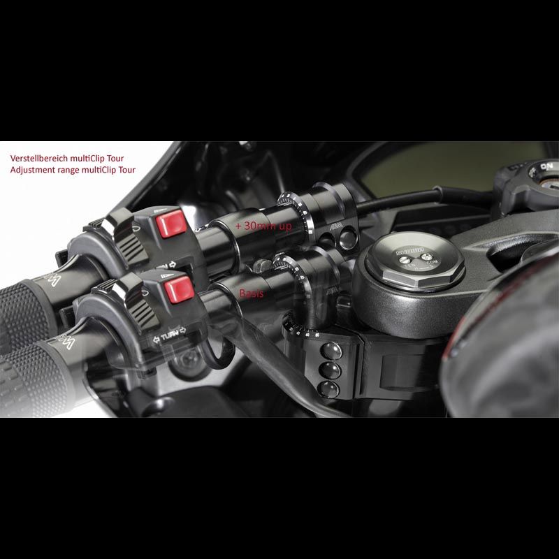 Des pack TOUR sont d'ores et déjà développés par ABM et comprennent tout le nécessaire pour un montage parfait, merci de nous contacter. (NOTA : Une moto équipée d'un grand guidon d'origine ne nécessite pas forcement d'autres pièces pour le montage si vous montez un Multi clip TOUR, nous contacter pour vérifier)