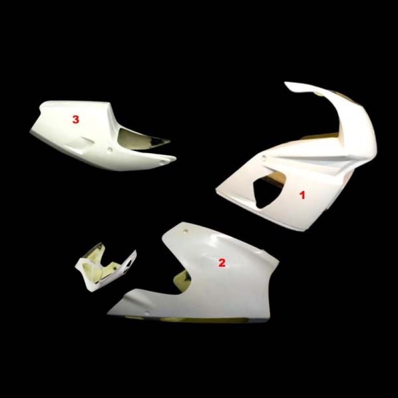 De plus, les carénages fibre de verre sont livrables en version allégée course. Ils sont également disponibles en carbone, carbone/kevlar, carbone/kevlar allégé ou titane/argent. Contactez-nous pour les finitions spéciales.