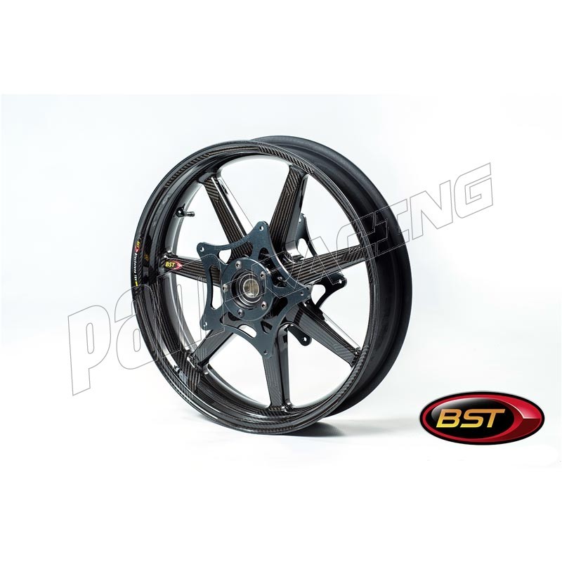 -Jantes monocoque BST type BLACK PANTHER à 7 branches, en fibre de carbone, conçues pour les motos avec suspension arrière classique, type bi-bras., livrées avec moyeux, roulements, entretoises, valves.