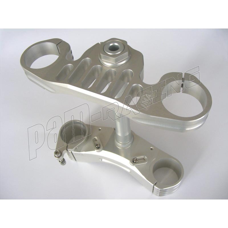 Ensemble de tés de fourche anodisées pour les Superbike (600/1000) modernes. Aluminium 7075 ERGAL usiné sur machine outil à commande numérique. Développé à partir d’études récentes sur la dynamique structurelle des motos « moderne », ces tés de fourches offrent une excellente occasion de moderniser le châssis de la moto.