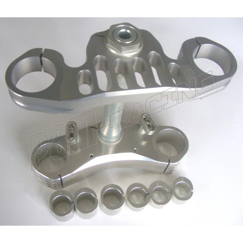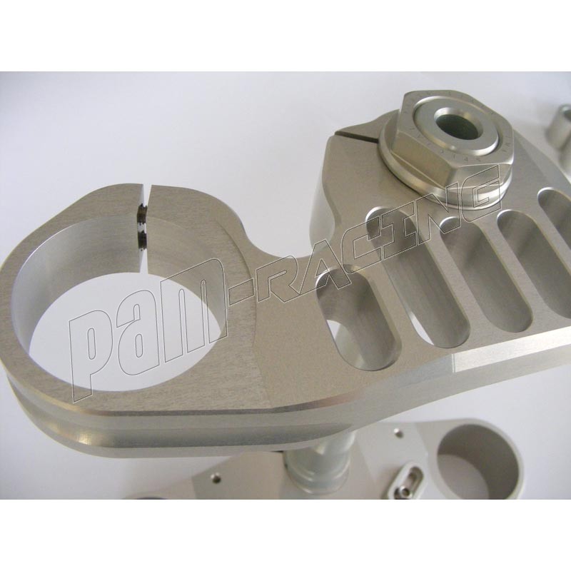 Ensemble de tés de fourche anodisées pour les Superbike (600/1000) modernes. Aluminium 7075 ERGAL usiné sur machine outil à commande numérique. Développé à partir d’études récentes sur la dynamique structurelle des motos « moderne », ces tés de fourches offrent une excellente occasion de moderniser le châssis de la moto.