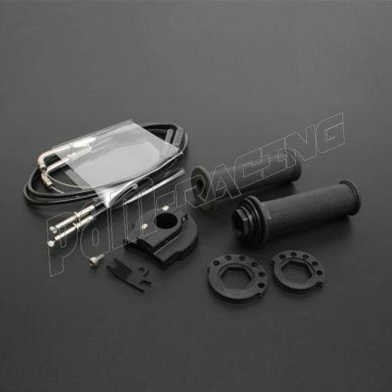 Poignée légère avec enrouleur en téflon limitant ainsi la friction.Livré avec les poignées caoutchouc. Les câbles ont été développés et fabriqués spécifiquement par type de moto, ainsi le passage des câbles est parfait (longueurs et coudes adaptés à chaque modèle de moto). Possibilité de démonter la poignée rapidement sans démonter pour autant les câbles des papillons grâce à un système de demi-coquille. Les câbles sont emboîtés dans la cocotte grâce à un système d'attache maintenu par une vis. N'étant donc pas vissés, ceux-ci se démontent aisément.