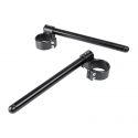 Les demi-guidons racing Bonamici sont en aluminium taillé masse. Disponibles en différents diamètres, il est également possible de les avoir en différentes couleurs sur demande, le noir restant cependant le standard. Les demi-guidons sont réhaussés de 15 mm avec un angle d’inclinaison de 6,5°. Les versions finissant par le code -B ne sont pas réhaussées et ont un angle également de 6,5°.