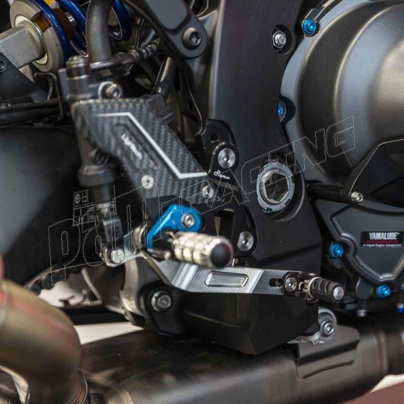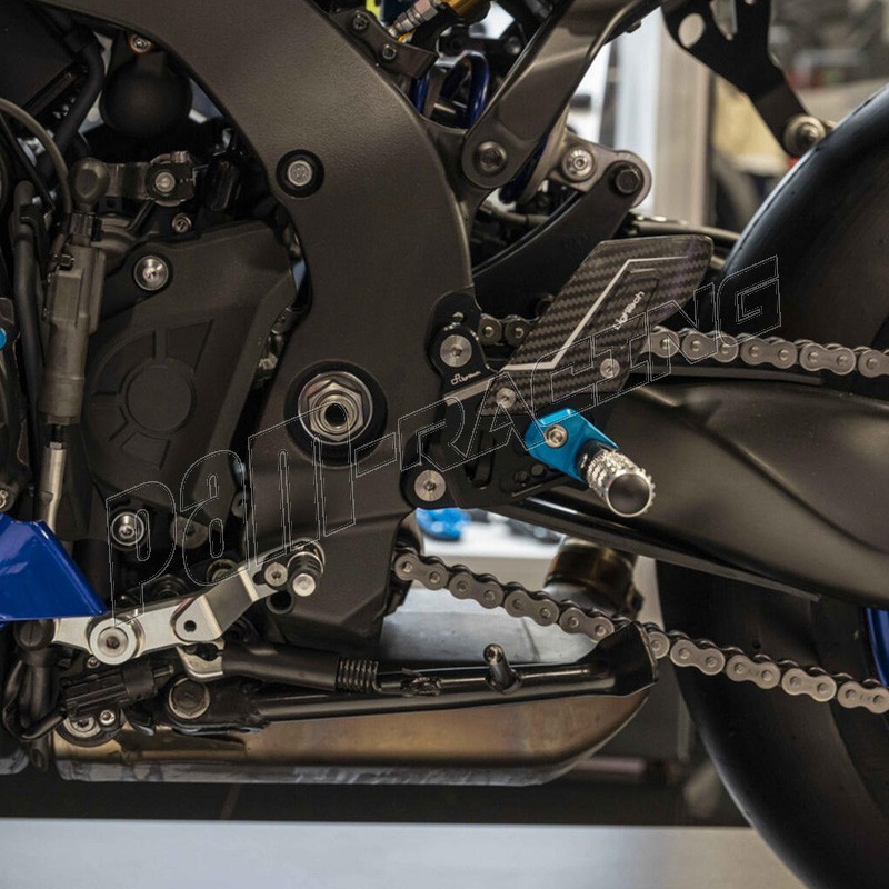 - Version "R" : Visserie complète en titane pour une solidité et un gain de poids, protèges-talons en carbone, reposes-pied pliables, embouts de sélecteurs articulés et supports de reposes-pieds rouges.