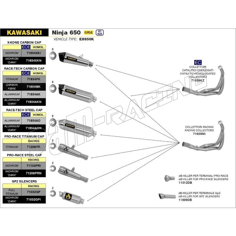 - Les Z650 et Ninja 650 nécessitent une ligne complète (silencieux et collecteur). Il est donc OBLIGATOIRE de prendre le collecteur Racing 71659MI ou Homologué catalytique 71659KZ pour pouvoir monter ce silencieux sur ces motos.