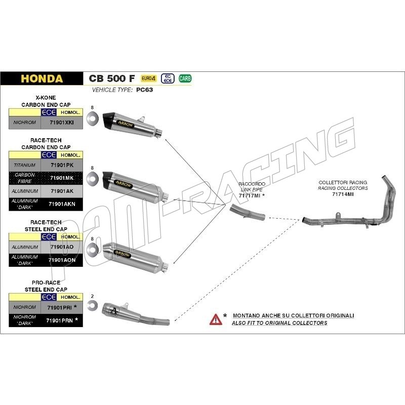 - CB500F 2019-2021 : pour le montage vous devez obligatoirement prendre le raccord intermédiaire 71717MI disponible séparément dans notre boutique. Peu ensuite se monter sur le collecteur Racing Arrow 71714MI (disponible séparément dans notre boutique) ou sur votre collecteur d'origine.