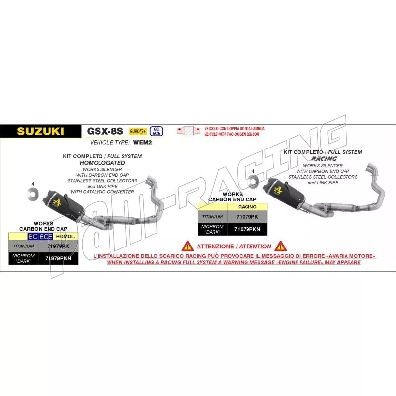 Ligne complète homologuée ou racing silencieux Works ARROW GSX-8R/S 2023-2026.