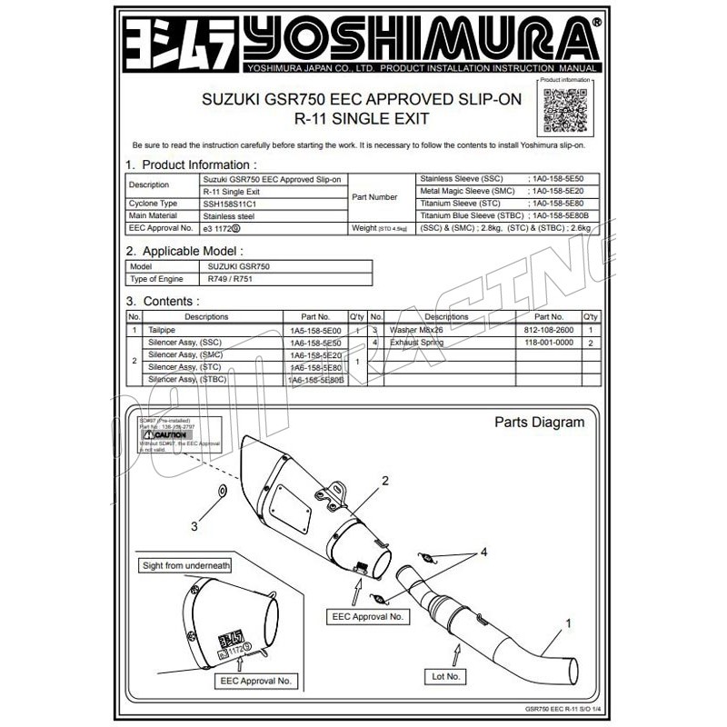 Pièces de rechange pour silencieux homologué Yoshimura R-11 GSR750 2011-2016.