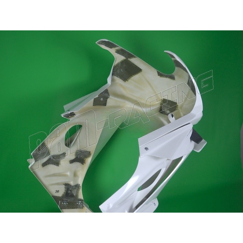 De plus, les carénages fibre de verre sont livrables en version allégée course. Ils sont également disponibles en carbone, carbone/kevlar, carbone/kevlar allégé ou titane/argent. Contactez-nous pour les finitions spéciales.