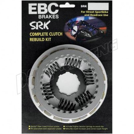 Kit RACING complet ‘’SRK’’ avec garnitures lisses de friction en fibre de Kevlar ®, disques de séparation en acier et ressorts renforcés formant un kit de haute performance pour moto sportive et 100% course. Chaque kit SRK est conçu pour vous procurer un confort de conduite irréprochable de votre moto. EBC recommande de ne jamais essayer de monter les disques séparément. Utilisez systématiquement l'huile préconise par le constructeur et toujours veillez à un niveau correct. L'huile sert non seulement à lubrifier mais également à refroidir l'embrayage.