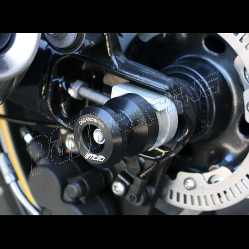 GSG Moto, société Allemande réputée pour la qualité de fabrication de pièces aluminium taillées dans la masse et de protections (avec absorbeurs de chocs), présente ici ses tampons de protections de chute.