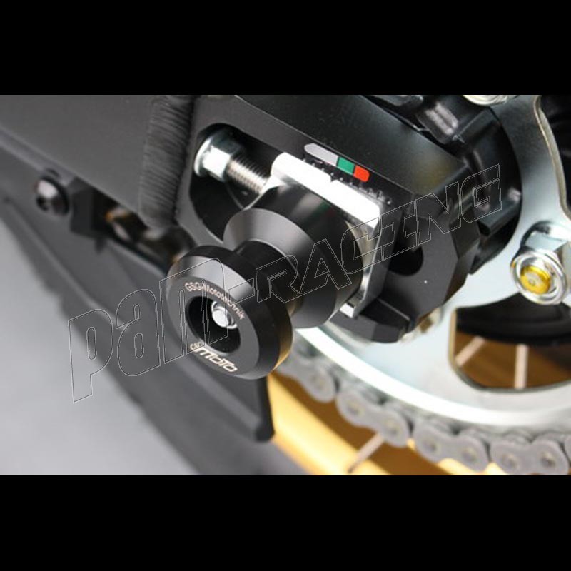 GSG Moto, société Allemande réputée pour la qualité de fabrication de pièces aluminium taillées dans la masse et de protections (avec absorbeurs de chocs), présente ici ses tampons de protections de chute.