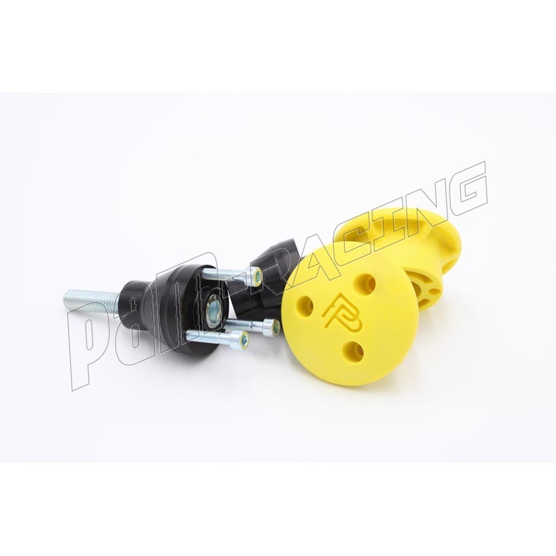 L'ensemble comprend deux embases, les vis de montage ainsi que deux tampons de protection. La partie du support est fabriquée en alliage d'aluminium dur -7075 T6- et le tampon est en plastique injecté renforcé en fibres de carbone afin de garantir une protection optimale contre l'abrasion en cas de chute.