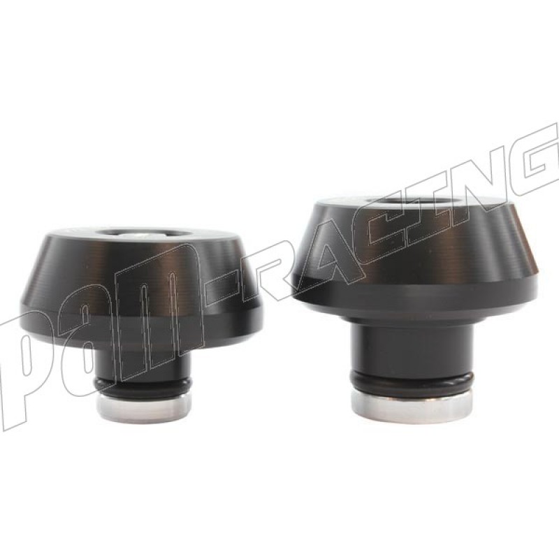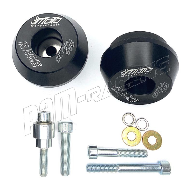 GSG Moto, société Allemande réputée pour la qualité de fabrication de pièces aluminium taillées dans la masse et de protections (avec absorbeurs de chocs), présente ici ses tampons de protections de chute.