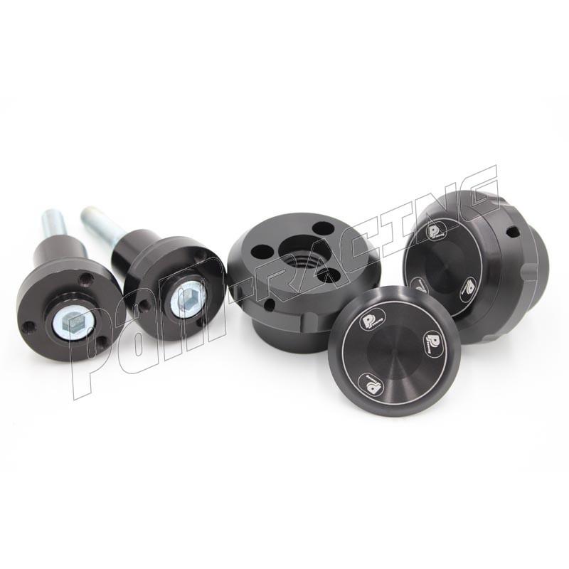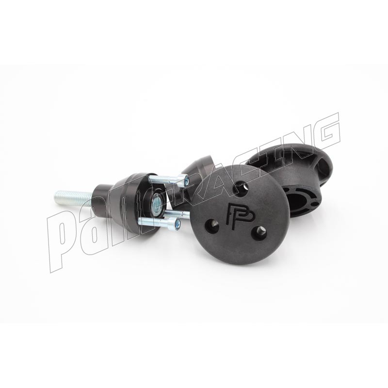 L'ensemble comprend deux embases, les vis de montage ainsi que deux tampons de protection. La partie du support est fabriquée en alliage d'aluminium dur -7075 T6- et le tampon est en plastique injecté renforcé en fibres de carbone afin de garantir une protection optimale contre l'abrasion en cas de chute.
