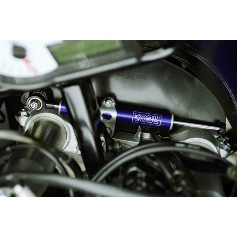 Réglable sur 20 positions, l'amortisseur de direction Toby existe en deux versions, différenciées par les réglages et l'hydraulique, plus fermée sur la version racing.