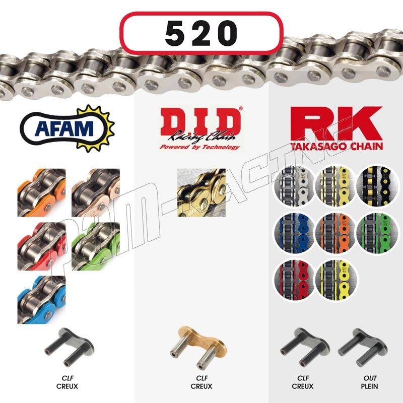 - chaîne MXU avec attache à rivets creux : ultra renforcée avec joints toriques UW-Ring, usage : enduro/cross, route et circuit.