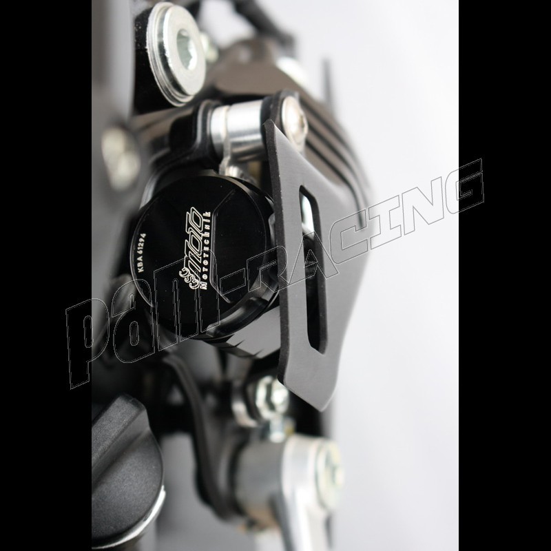 GSG Moto, société Allemande réputée pour la qualité de fabrication de pièces aluminium taillées dans la masse et de protections (avec absorbeurs de chocs), présente ici ses tampons de protections de chute.