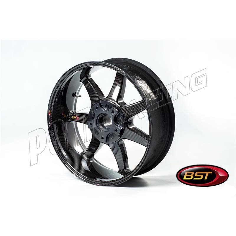 -Jantes monocoque BST type BLACK PANTHER à 7 branches, en fibre de carbone, conçues pour les motos avec suspension arrière classique, type bi-bras., livrées avec moyeux, roulements, entretoises, valves.