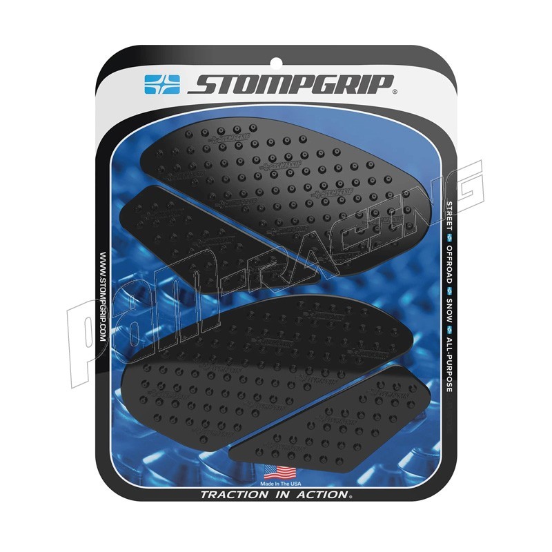En 2002, STOMP Design élargit sa gamme jusqu'aux sports mécaniques, en lançant les grips de réservoir STOMPGRIP, spécialement conçus pour les moto-cross. Ces grips abrasifs ont pour vocation de garder le pilote en selle, en collant à son pantalon ou à ses bottes. Ils sont depuis lors applicables aux machines de route, de cross ou de quad. Ce sont finalement des accessoires indispensable, et des alliés contre la fatigue et le ballotage, quelle que soit votre machine de prédilection. Les grips sont spécialement conçus en fonction de la physionomie de chaque machine, ils sont également coupés à l'arrondis, afin d'éviter les décollements précoces. La surface en caoutchouc est soit transparente, soit noire, pour respecter l'esthétique de votre machine. Ces produits sont conçus pour s'user à la manière des pneus, et sont à remplacer périodiquement.